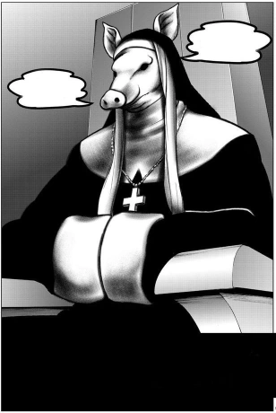 Juusan has the face of a pig and wears a nun costume with a cross necklace. Her original human form is shown to have light brown hair.